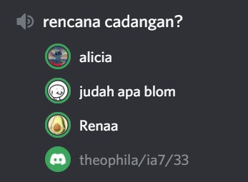 Diskusi malam-malam adalah kebiasaan kita dan biasanya dalam diskusi yang paling aktif adalah Renata, Judah, Fila, dan saya. Diskusi kita biasanya dimulai dengan berbicara melalui discord call pada jam 7 atau 8 malam dan dapat sampai jam 12 malam. Sebagian besar anggota kelompok hanya dapat menetap sampai jam 9 dan 10, dan yang biasanya tersisa di call hanya Renata, Judah, Fila, dan saya. Saya ingat suatu malam kita kerja kelompok sampai jam 12 karena Judah, Fila, dan saya menerjemahkan skrip kita ke Bahasa Inggris, sedangkan Renata sedang meremix lagu yang akan dipakai untuk senam kelompok kita.